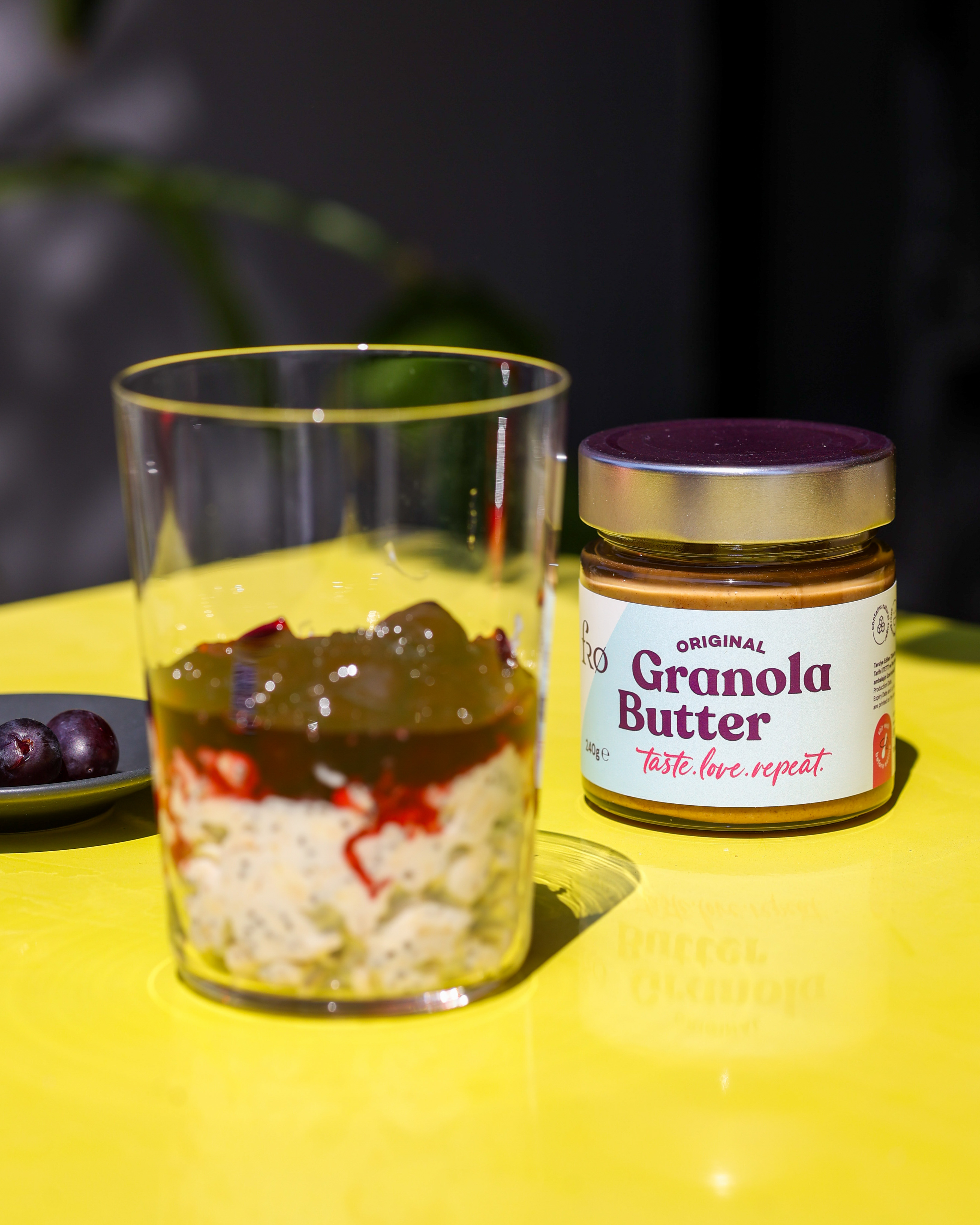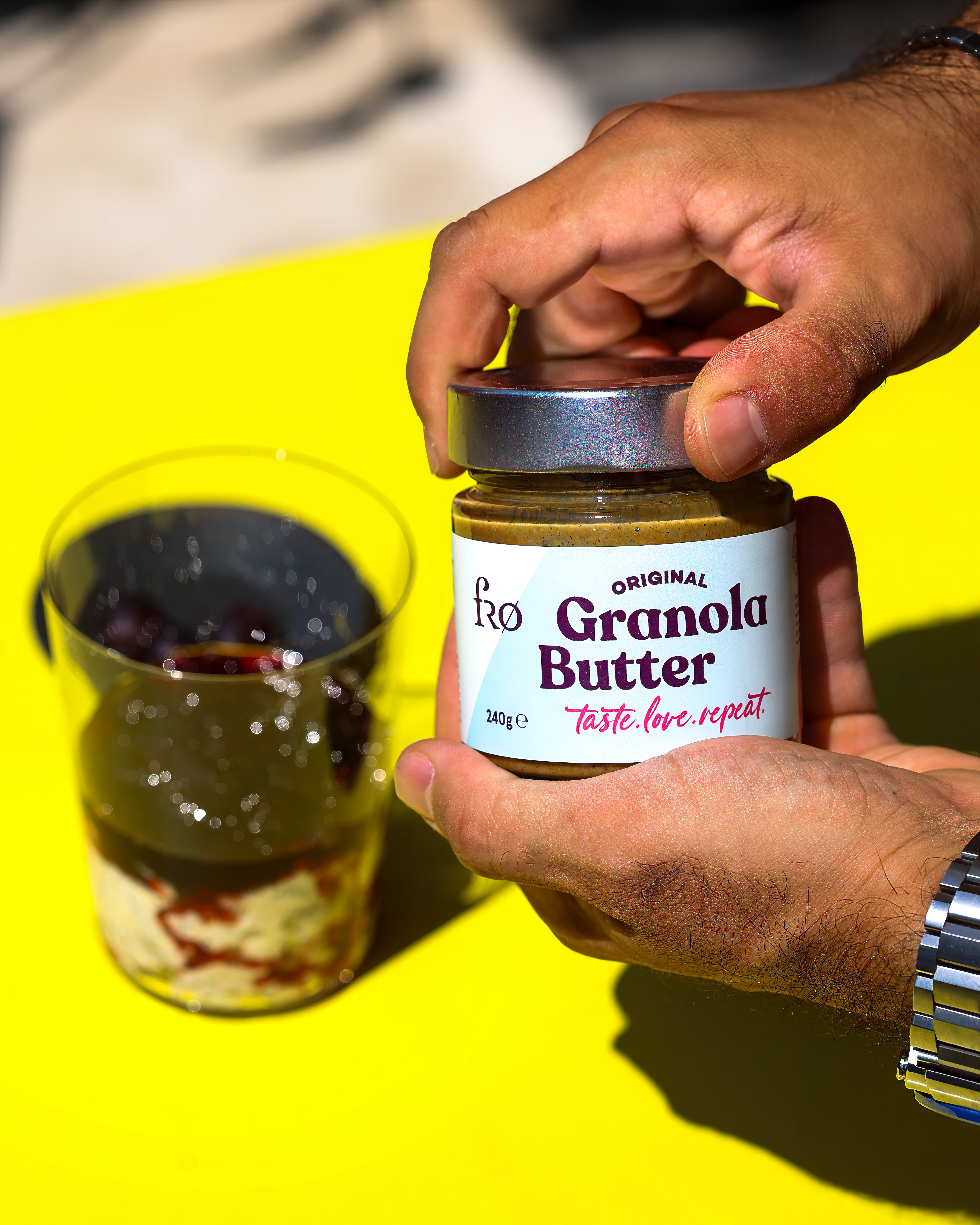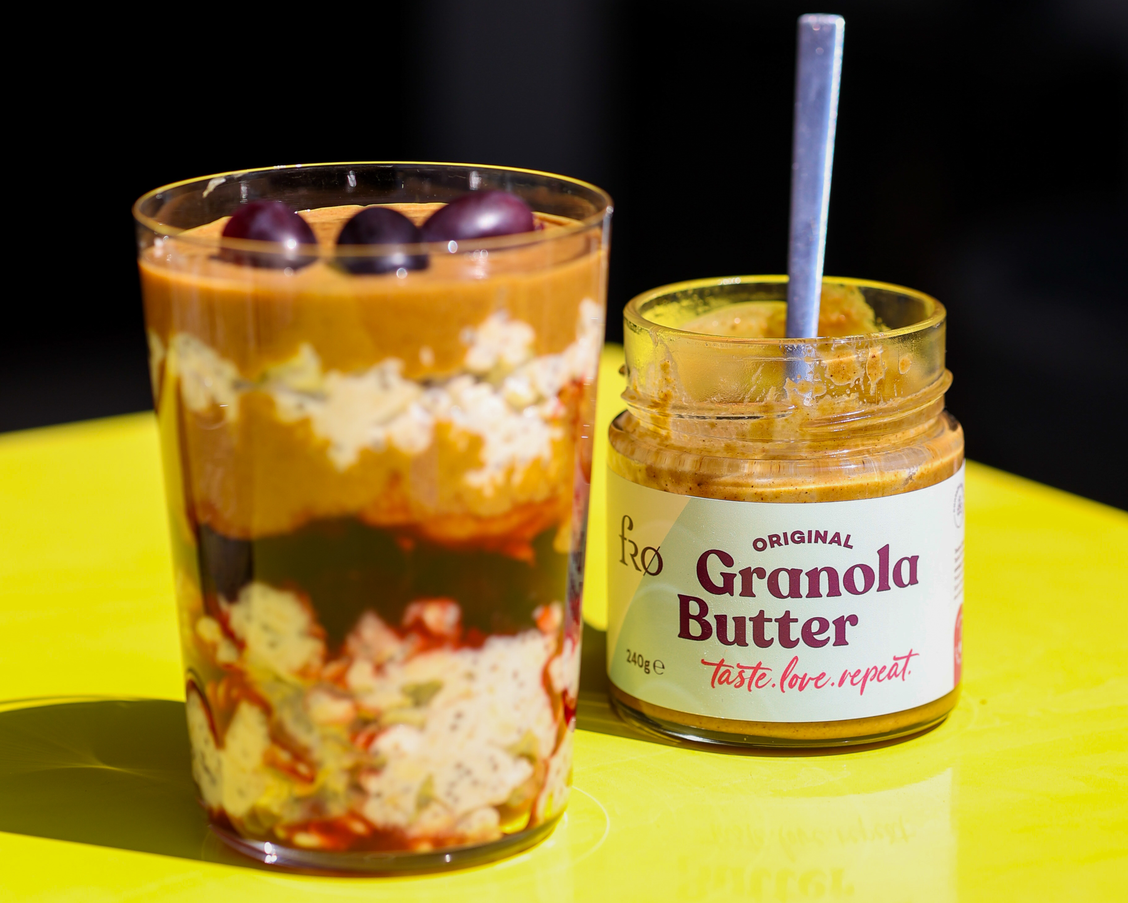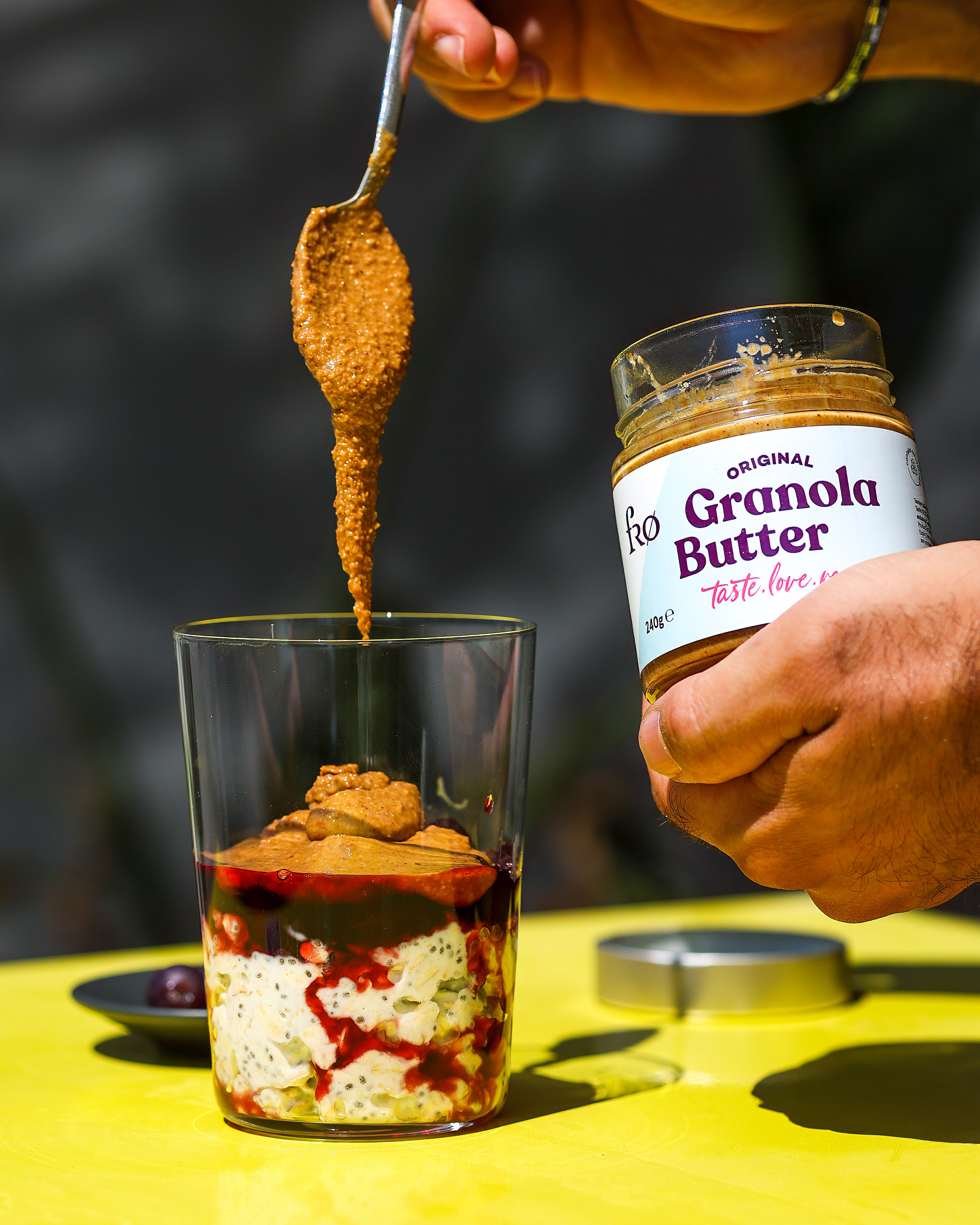 Bright, sunny, kitchen-table energy with that bold yellow pop in the background. The vibe is simple and craveable: clean glass, glossy fruit layer, creamy base, and the star moment is the thick Granola Butter ribboning down from the spoon. Keep it tactile and appetizing with close texture focus, gentle hand movements, and a calm but upbeat pace. Color stays punchy and warm, everything looks fresh, easy, and repeatable.
