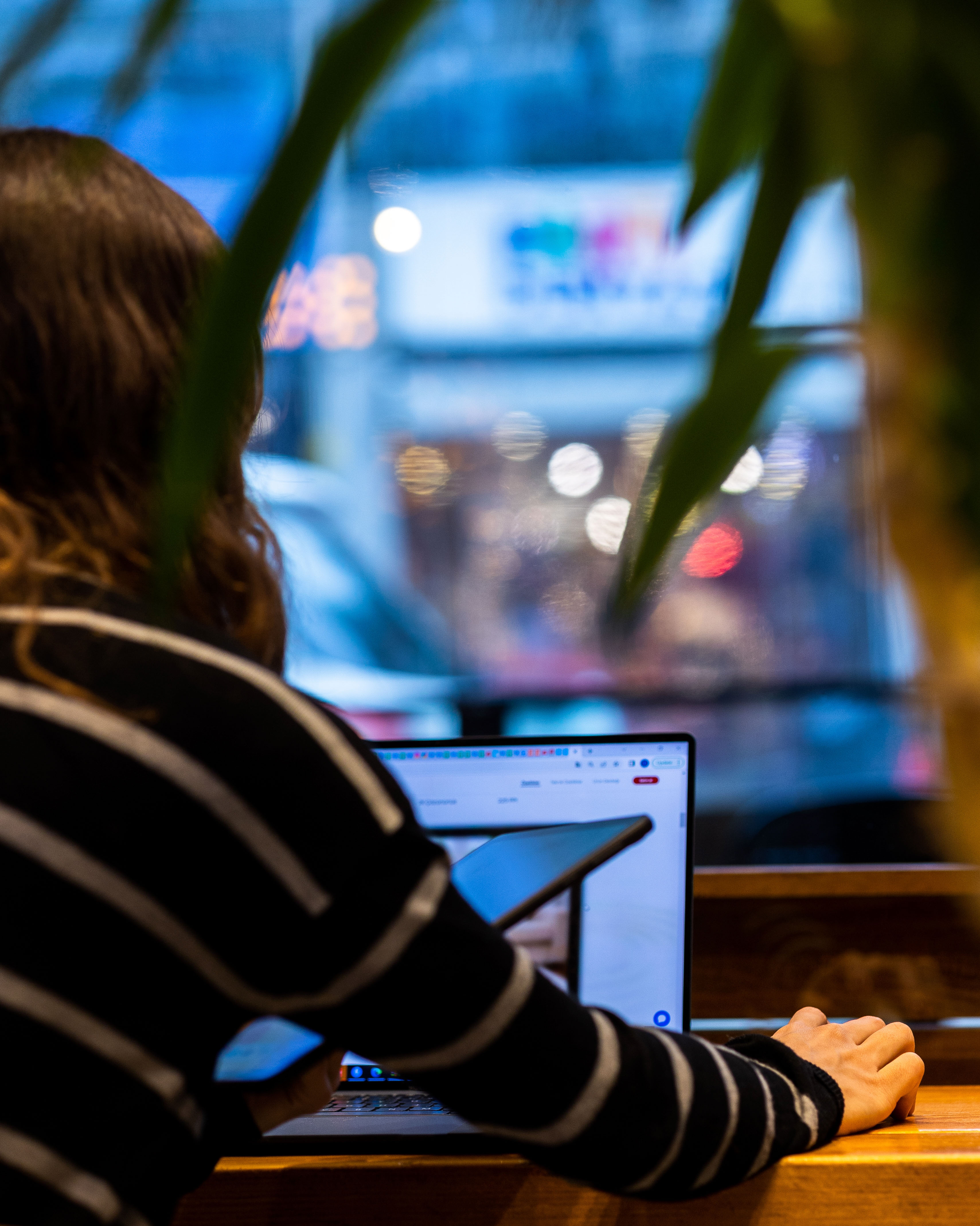At the café we emphasized harmony between two screens. With the laptop open, apps, files, and notes on the tablet read as clear and organized. Simple finger gestures communicate fast, intuitive touch control. The soft texture of latte art and the wooden table add warmth, showing technology meeting daily ritual in balance.
